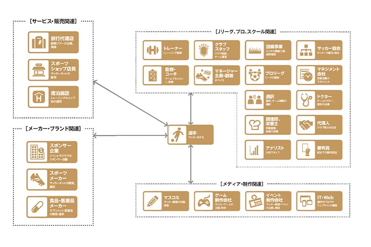 サッカーは非常に巨大で人気の高いコンテンツであるため、多彩な業種がそれぞれのやり方でこの業界とつながっている。図で取り上げたのはごく一部の例に過ぎず、その気になれば、あなたもサッカーに関われる仕事を数多く見つけることができるはず。就職先を選ぶ際には、どのようにサッカーと関われるかを考え、大好きなサッカーに携わりながら生きていく道を模索してみてはどうだろうか。