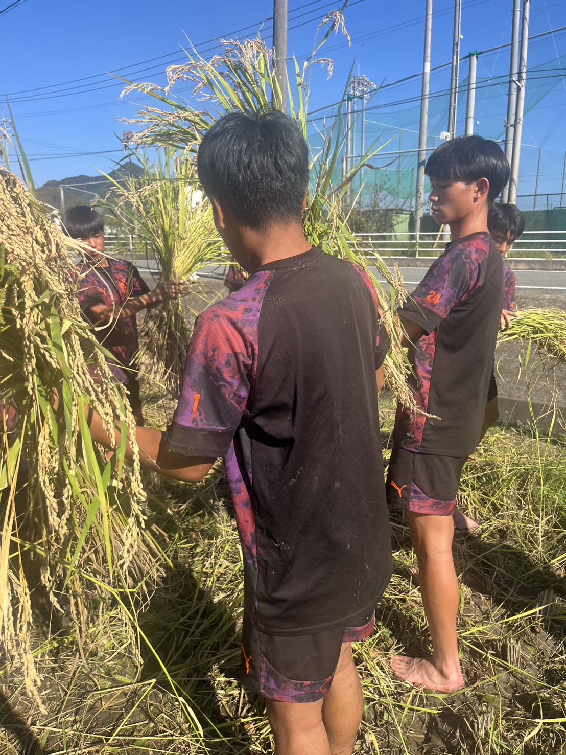 特にお米の収穫は、部員全員で協力して行う大切な時間です。黄金色に実った稲を一束一束丁寧に刈り取り、まとめ、運び、次の工程へとつなげていきます。慣れない作業に苦戦しながらも、「あと少し」「こっちを手伝おう」と声を掛け合う姿は、まさにチームそのものです。畑で流す汗は、仲間への信頼や責任感を育てる時間でもあります。