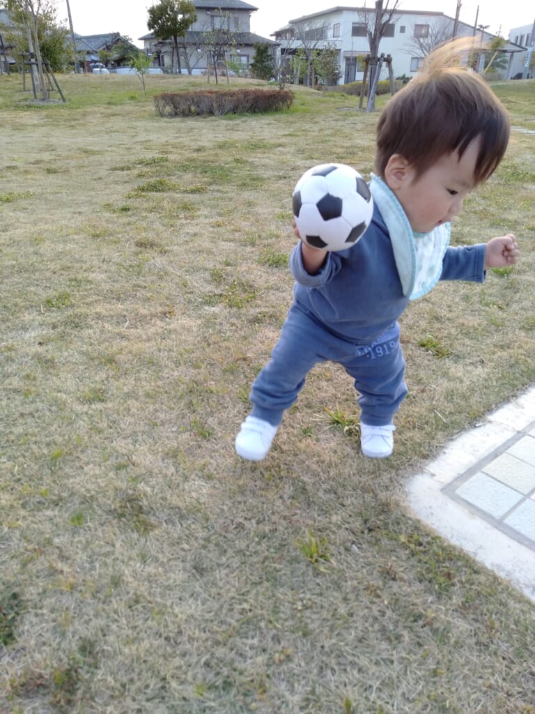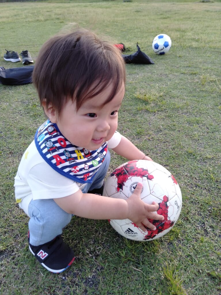 1歳を過ぎて歩き始めた頃からは、週末は芝生広場に行ってクッションボールを一緒に蹴るようになりました。