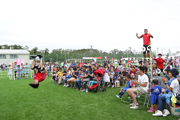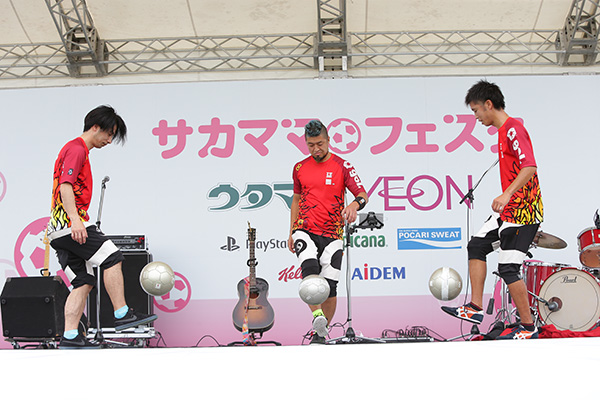 MIFAのGAKU-MCさんとフットボールエンターテイメント集団「球舞」のコラボで幕をあけたステージイベント。フェスタ初となる音楽とフットボールを融合したパフォーマンスに、ママもキッズも白熱!GAKU-MCさんは新曲を含め3曲を披露してくれました。