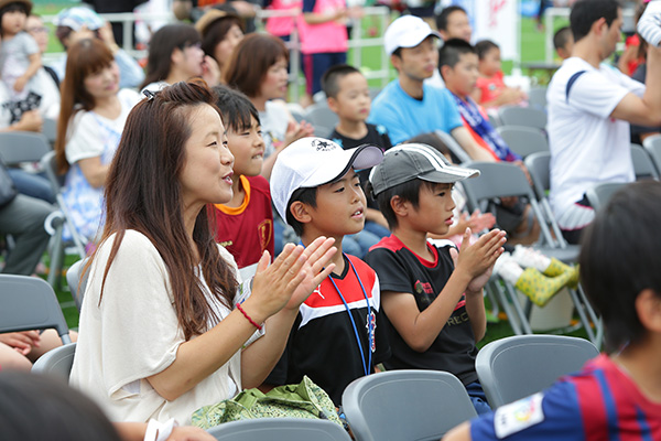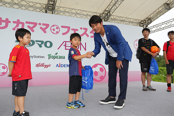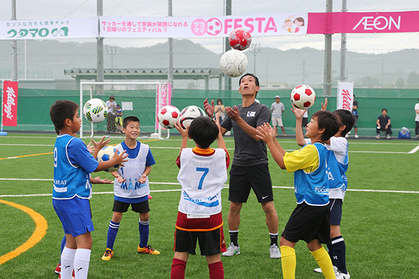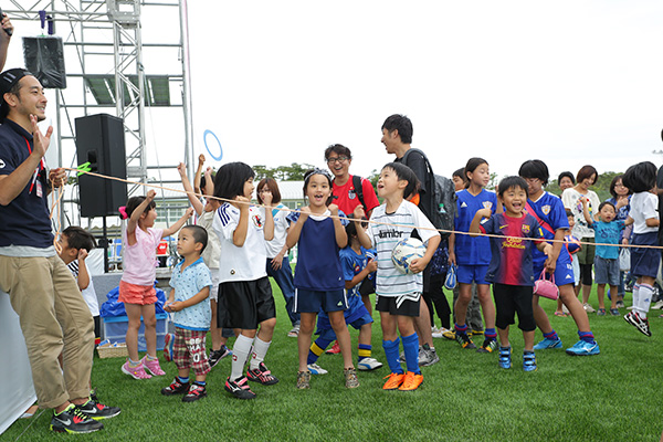 「サッカーを楽しむこと」に重きをおいたメニューが中心の親子サッカースクール。ステージに登場してくれたGAKU-MCさんと球舞のメンバーも参加してくれました。