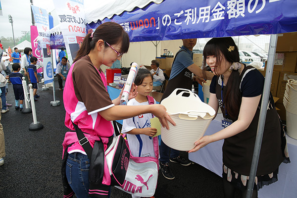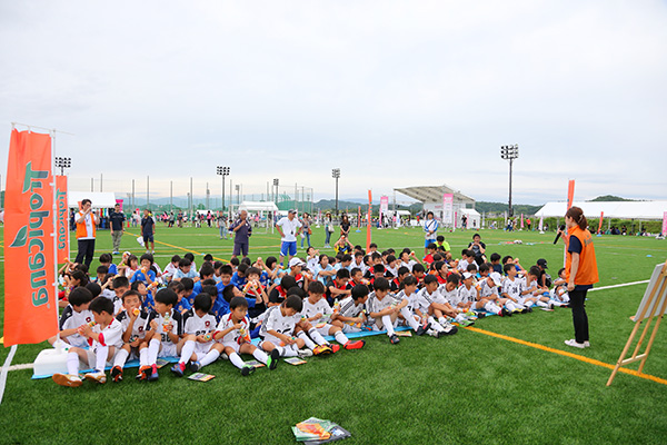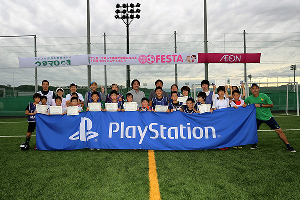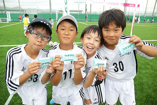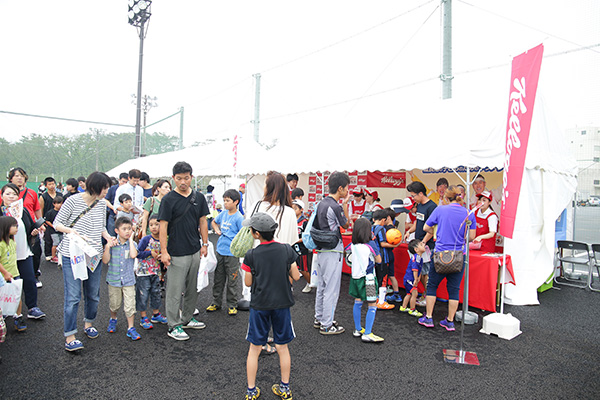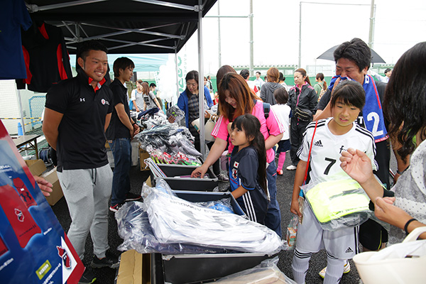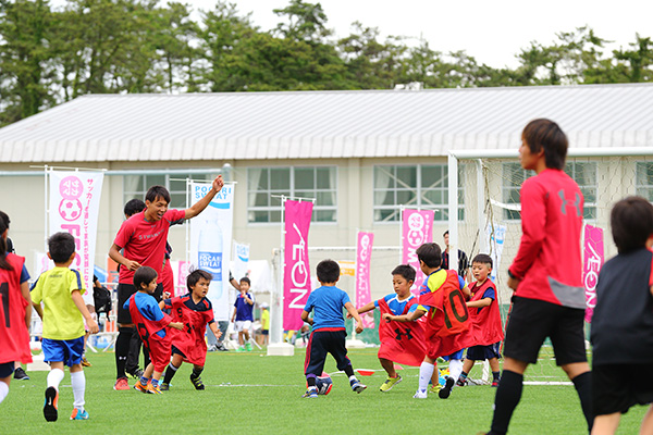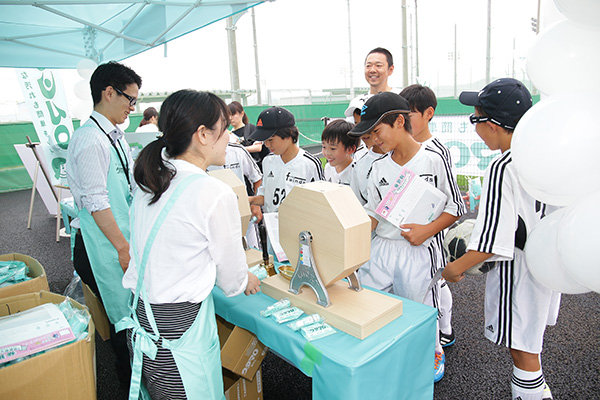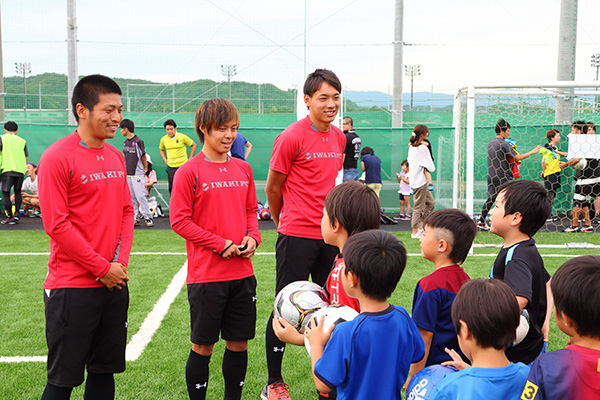 地元いわき市で発足したばかりの「いわきFC」の選手たちによるサッカースクールを実施。終了後にはサインをもらうキッズも!