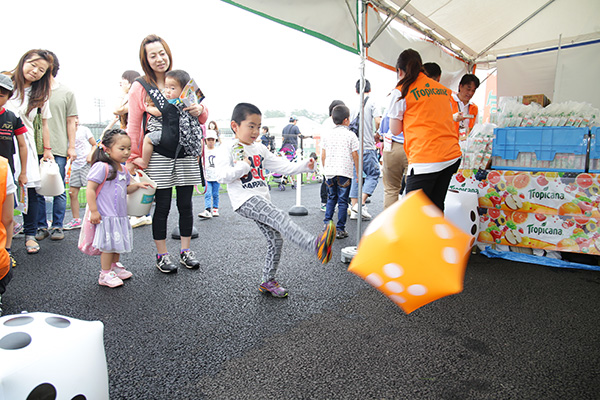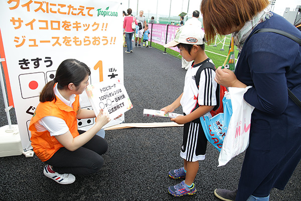 クイズに答えてサイコロをキックすると、目の数に応じてジュースがプレゼントされました!