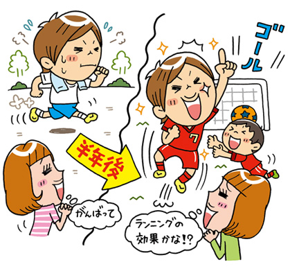 保護者の方は、どうしてもすぐに効果を求めてしまいませんか?「ランニングをするとサッカー力が上がる」と知って、すぐに取り組んでいただくのはいいのですが、効果が早々にでるものではないのです。基本的に運動能力は遺伝すると言われ、しかも、母親の運動能力が色濃く関係すると言われています。 ランニングは誰でもできるスポーツだけに、つい大人の基準で「もっと頑張りなさい」と言ってしまうことも多いと思うのですが、お母さんたちは、自分の運動能力を振り返り、それも踏まえて、お子さんの今の運動能力をみてあげることです。 ランニングは、コツコツと続けることが何よりも重要。続けていれば、いつのまにか試合に毎回出て、活躍していたりするのです。ただし、個人差があるので、ときにはランニングをはじめて3か月程で効果がでることも。だからといってそこでやめてしまうと、すぐに効果は消え失せてしまうので、続けることが習慣づくように保護者の方はサポートしてあげましょう。