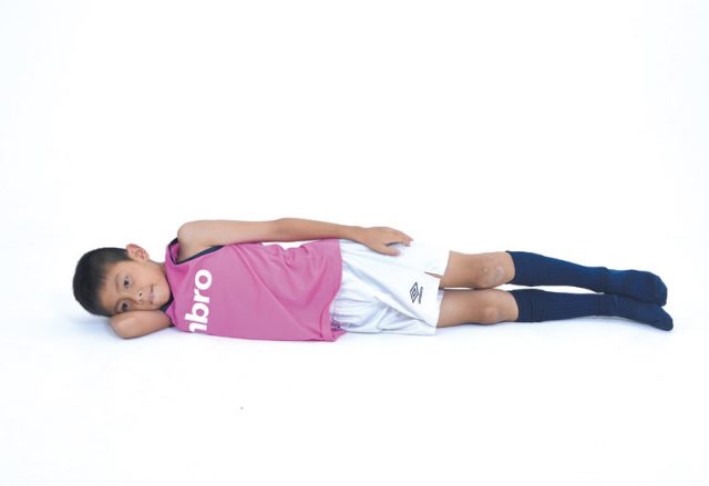 右手を枕にして、横向きに寝ます。体が一直線になるように。