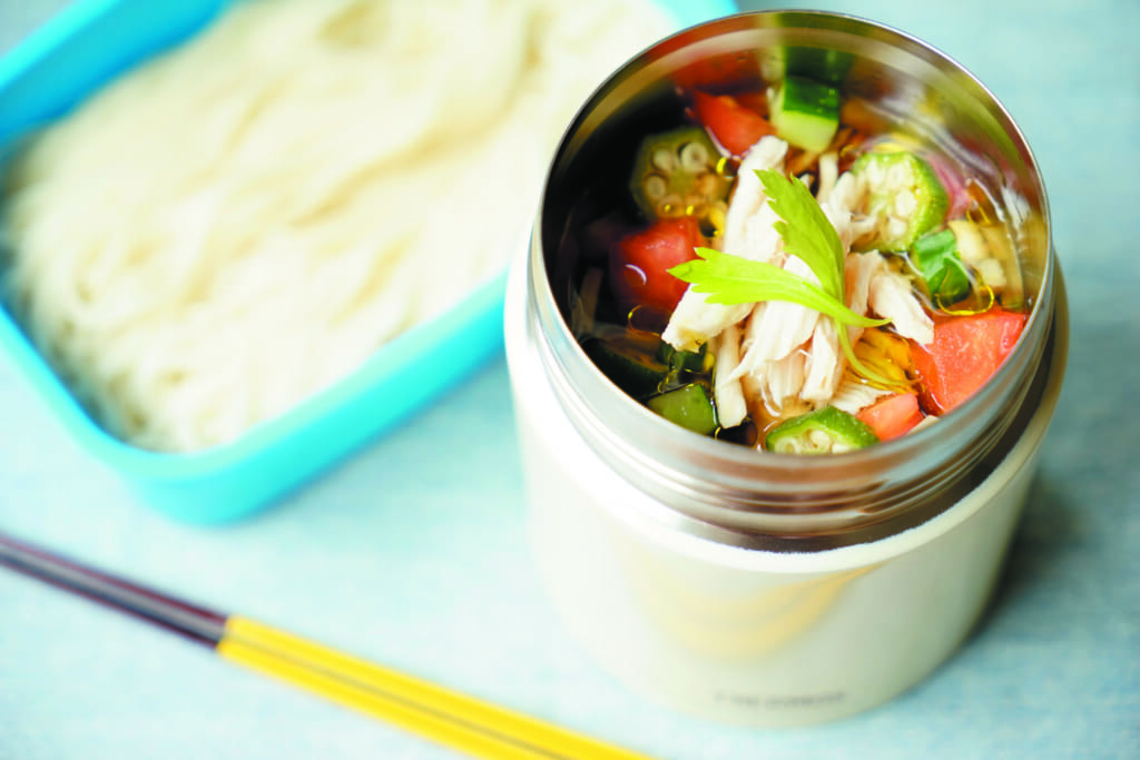 ●めんつゆ、食べやすく切った夏野菜、熱を通したささみをスープジャーに入れるだけ。お弁当箱にそうめんを入れて、食べる直前につゆをかけてどうぞ。