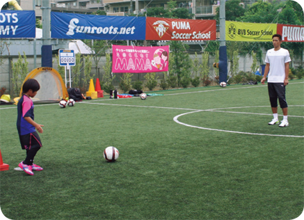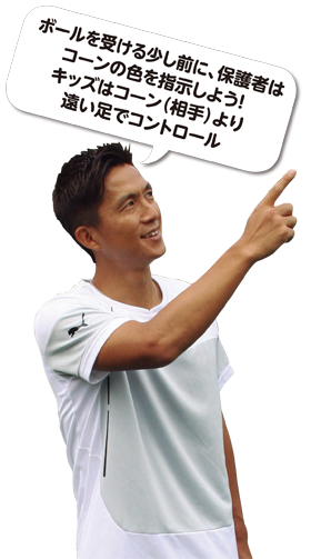 基本的な流れはLesson1と同じですが、ボールを受けたときに敵がいると想定することで、より実践的なコントロールを身につけていくメニューです。 Lesson1と同じようにゴールを背にし、お父さんやお母さん、友達にパスを出してもらい、ボールを受けるときは遠い方の足でコントロールします。このときに敵がいると想定し、敵とは逆の向きにターン。そしてドリブルからシュートを打ってゴールを狙います。ターンするときは、身体ごと向きを変えるのがポイントです。 試合では、ボールをコントロールしながら、ドリブルやシュートなど次のプレーをできるだけ早く行うことが大切ですが、必ず敵がボールを奪いにやってきます。敵に抑えられたときに、シュートやドリブルをスムーズに行うには、敵とは逆の方向へコントロールする力が欠かせません。このメニューを繰り返し練習して、敵にボールを取られないコントロール力をつけていきましょう。