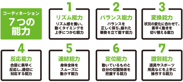 「リズム能力、バランス能力、変換能力、反応能力、連結能力、定位能力、識別能力に分類され、スポーツを行っている時は、これらの能力が複雑に組み合わさっています」。