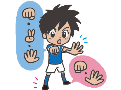 キッズは、親(または友達)がだしたジャンケンに負けるものを1秒以内に出す。右手、左手3回ずつを繰り返そう。