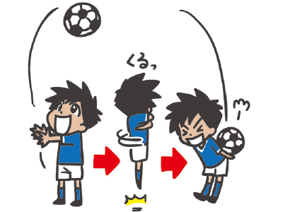 - 自分より高く上げたボールを1回転してから背中でキャッチ。右、左まわりで2回連続できればOK。
