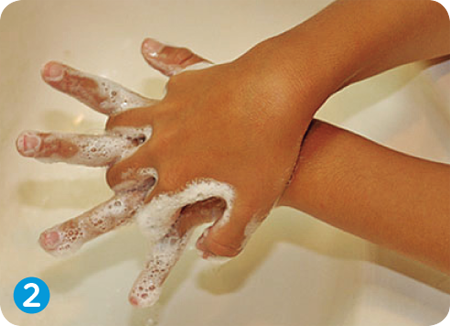 ①両手を水で濡らし石けんなどを手にとった後、両手のひらをよくこする。