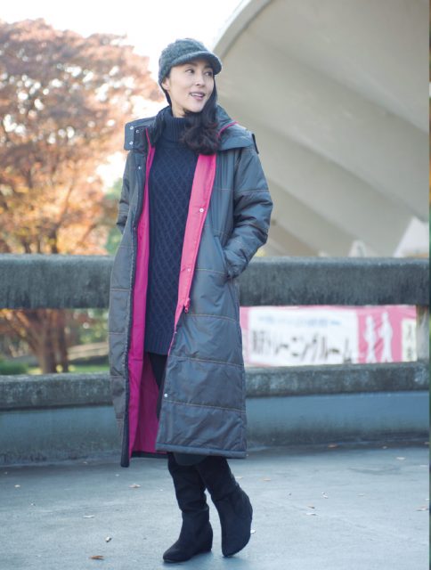 UMBROのベンチコートで、キッズとのペアを実現。ママ/ベンチコートは上と同じ、ネックウォーマー¥2,900(Right-on)、ブーツ¥9,000(le coq sportif)、キッズ/ベンチコート¥10,800(UMBRO)、他は私物