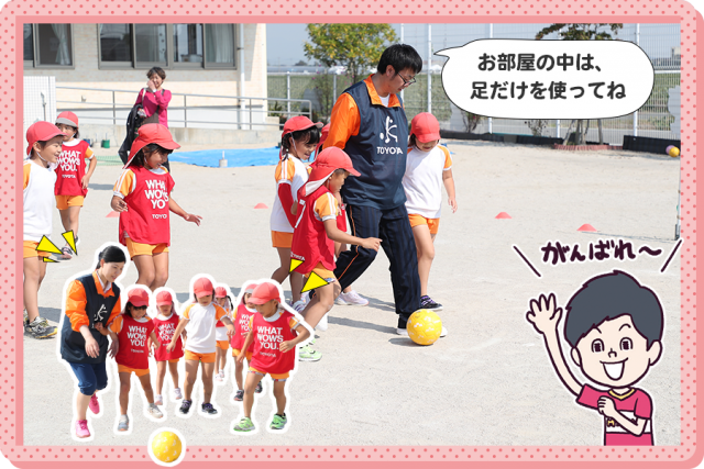 各都道府県のサッカー協会の指導者と、全国のトヨタの各販売店・共販店・レンタリース店のスタッフが、幼稚園や保育園に出向いてサッカーを指導します。トヨタスタッフは、JFA公認キッズリーダー(指導者)の資格を取得しているのもポイント。