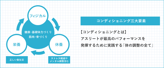 コンディショニングとは、運動におけるパフォーマンスを最大限に発揮するための体の調整のこと。「フィジカル」「休養」「栄養」の3要素からなります。