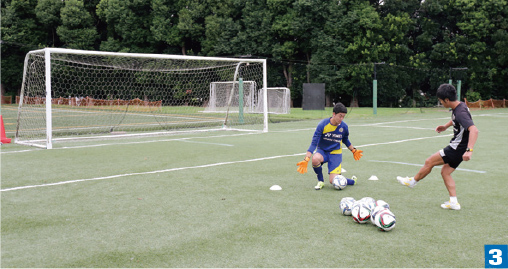 FWがドリブルしてくるタイミングで間合いをつめてシュートブロックする。ポイントは2のようにFWからボールが離れた瞬間を逃さないこと。素早くコースに入り、低い構えで対応。この練習はブロックのみだが、ドリブルにも対応できるイメージを持つこと。ドリブルされても対応可能な構えかどうか確認することもバリエーションになる。