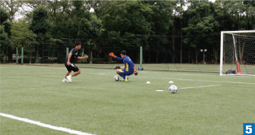 - FWとの間合いをつめた状態で基本姿勢よりも低く構える。手も低く構え、手のひらもボールへ向けることで、足下へのシュートコースを消すことができる。