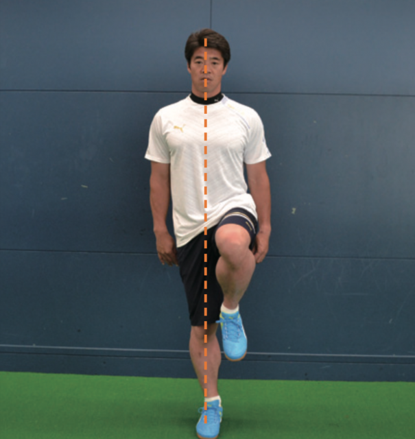 軸足で身体のバランスを保ち、上げた足を前後に動かす。膝の高さを一定に保つことがポイント。身体は軸足に沿って一直線に。