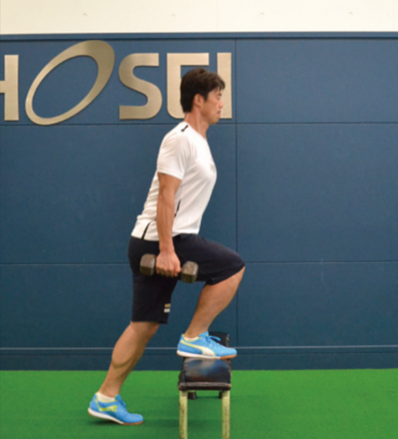 台の上に両足を乗せ、基本となる姿勢をキープする。上級者は写真のように錘を持ってもOK。