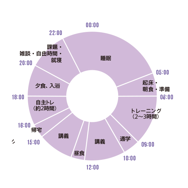 これは水曜日のスケジュールなんですが、この日は6時からトップ、セカンドが一斉に集まり、対人トレーニングなどハードな内容をこなします。その後に大学に行って授業を2コマ受け、戻ってから自主トレをします。就寝は22時頃。1年生の頃は合宿所内の仕事があったので、もう少し遅くまで起きていました。 ※この記事は2016年7月に掲載したものです。