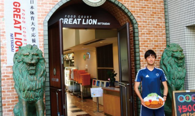 日体大の学生が集う学内食堂では、写真の学生幹事・相沢が持っているカツカレーの食品サンプルのように、大ボリュームの食事が低料金で食べられます!