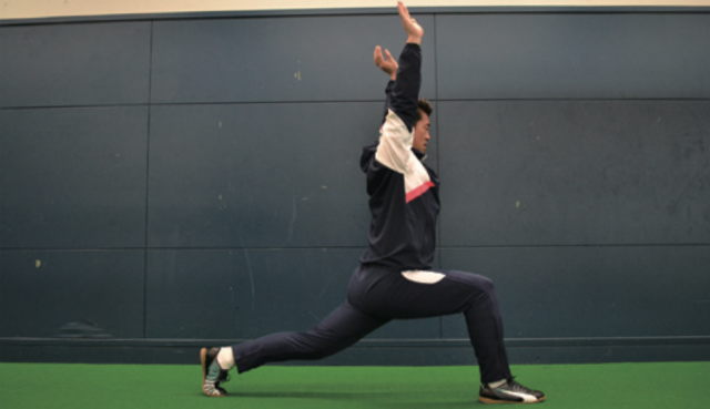 手を上に挙げることで正しい姿勢を保ちやすくする。手は耳の後ろに肘がくる感覚で、前の足は膝から下が地面に対して垂直になっている状態にしよう。そこから上下に体を動かしていく。上げた体をストンと下に落とす感覚で弾むように行うこと。練習前に、片足15回を2~3セットとやるといいだろう。