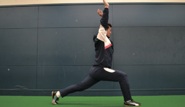 窮屈に感じるかもしれないが、両腕を挙げることで、正しい姿勢を保つサポートとなる。足をおもいっきり広げることが目的ではないため、前足は膝から足先が垂直になるようにして後ろ足を伸ばそう。そこから上下に弾むように体を動かしていく。股関節の稼働領域が広がれば、プレーに柔らかさも出てくるし、懐深くボールを収めることもできるようになっていく。