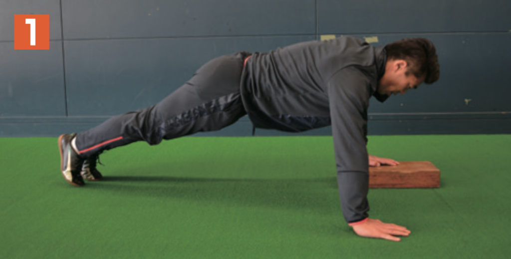 ブロックや板などの台の上に片手(写真1は左手)を置き、その場で腕立てふせを行う。肘を上げたら、体勢を保持しながら横に体重移動し、今度は先ほど、地面についていた片手(写2真2は右手)を台の上に置き、腕立てふせ。そして、また横に体重移動して逆の手を台の上に乗せて腕立てふせ。この動きを繰り返す。横に体重移動する際も体幹は維持する。