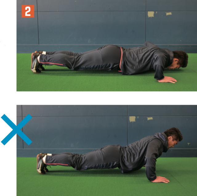 まず着目したいのが、見せる筋肉ではなく、使える筋肉を作ること。筋力をつけても、プレーで使える筋肉でなければ意味がない。ここではただ単に筋量を増やすのではなく、動ける筋肉をつける方法を紹介。動作としては、ゆっくりではなく、テンポよく、速いスピードで上げ下げすること。擬音での表現になるが「ストン」と下ろして「ギュッ」と力を入れて上げるイメージ。このとき体のラインが「くの字」や「のの字」になることなく、一直線に上げ下げすることで、体幹のトレーニングにもつながる。また、大きく上下させることで、肩胛骨周りのストレッチ効果も出る。練習前に行えば、より全身が使えるようになるはずだ。