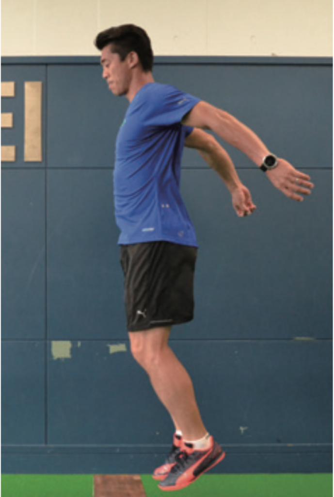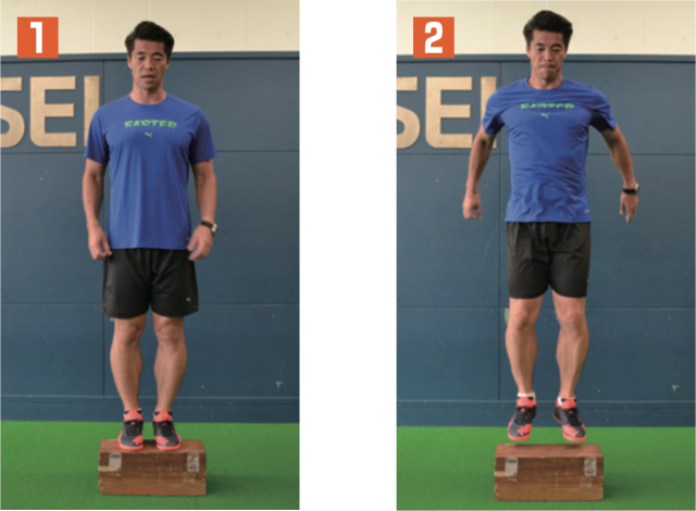 台を飛び越えて、地面に着地した足首が曲がりすぎないように注意。足に負荷が掛かっていることを感じながら行おう。飛んだときは背筋を伸ばし、身体が一直線になるイメージ。