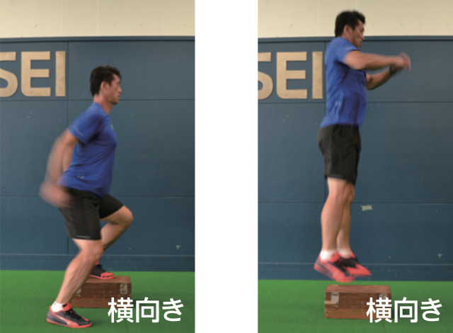 瞬発力を養うには、まずジャンプ力を高めるのが効果的だ。そのベースとなるジャンプ力を身につけるには、両腕両足を使い軽やかに飛ぶトレーニングを行う必要がある。用意した台の上に乗り、勢いをつけて跳びながら降り、再び勢いをつけて台の上に乗るという単純なメニューだが、テンポよく行うことで瞬発力が鍛えられる。足が接地する際には膝が曲がりすぎず、足首がつぶれないように注意しよう。