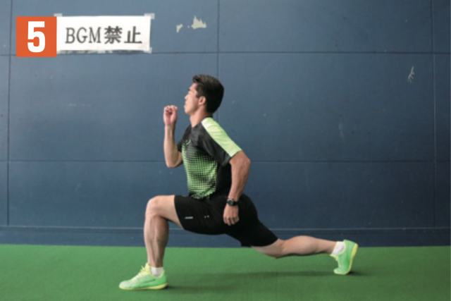 片足(写真では右足)を前に蹴り出し、戻した反動を利用して、次の一歩で大きく前に踏み出す。重要なのは、前足の着地と後足の着地が同時になるようにタイミングを合わせること。背筋をしっかりと伸ばし、なるべく大きく足を前に開くこと。このトレーニングは、ステップワークやランニング時における足の運びのタイミングにもつながっていく。