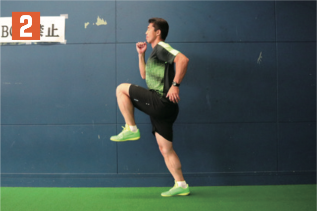 リズムを取りながら、片足の太ももを上げる動作を繰り返す。軸となる指示足が着地する瞬間に、もう一方の足の太ももが一番高い位置に到達するようにする(写真 2)。タイミングがずれてしまうと効果が得られないので注意。膝(太もも)は可能な限り、上げられるところまで上げ、軸足はなるべく曲がらないように着地することも心掛けよう。
