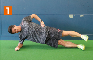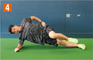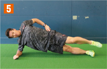 地面側の肘と足で身体全体を支える横向きの体幹基本姿勢をとる。そこから、腰の位置が下がらないように注意しながら、上側の足を徐々に上へとあげていく。このとき、足と膝を伸ばした状態で行うこと。膝が曲がっていたり、猫背になっていると適切な負荷が掛からなくなり、効果は半減してしまう。