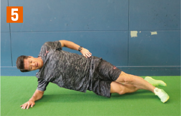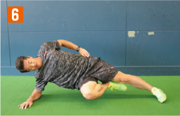 走る動作に近い体幹トレーニングを紹介する。まさに相手と接触しながら走る動作に効果てきめんのメニュー。まず横向きの体幹基本姿勢を取り、そこから上の足を胸元へと引き上げていく。その際、地面側の腰や膝が下がって「く」の字にならないように注意しよう。また背筋が曲がってしまえば、トレーニング効果は半減してしまうため、上から見て一直線になっている状態をキープすること。胸元へと引き上げる足は、可能な範囲でギリギリまで胸へと近づけること。引き上げる足も、膝から下までが真っ直ぐになるように注意。