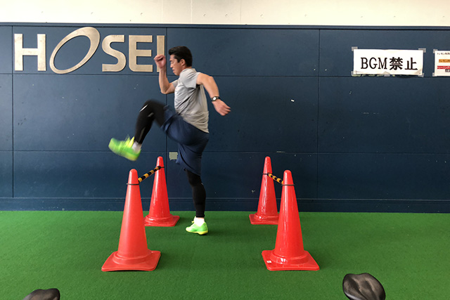 股関節の可動領域を広げるためにも、大きくポールを越えて、支持足が曲がらないように注意しよう。また、重要なのが大きく腕を振ること。腕を使わなければ、体幹を保ったまま移動する動作になっていないので、背筋や姿勢を意識しながらトレーニングを行おう。