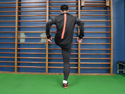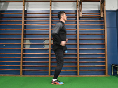 足を乗せる台を背にして、片足を乗せる。フロント時よりも、低い位置でOK。軸足で身体を支え、片足ジャンプを繰り返す。3種目ともに共通することだが、高く飛ぶことよりも姿勢を崩さず、足裏全体で地面を踏むことを意識する。走っているときに近い状態なので、膝が曲がらないことと、前傾姿勢にならないように身体を起こしてジャンプを繰り返す。台に乗せた足の力を抜くこともポイント。