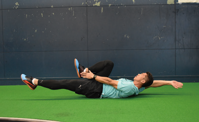 仰向けの状態で肩甲骨と足を浮かせる。手と足を連動させて交互に動かしていく。手は肘を曲げずに、背中から動かしていくイメージ。また、胸に引き寄せた足首は90度に、伸ばした足は底屈させる(走っているときの動きに近くなる)。リズムよく手と足を動かすことが重要になるため、ゆっくり、正確な動きを心掛けよう。