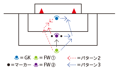 すべてのパターンで写真1FW①がペナ外の正面付近からスタートする。FW②はマーカーの間でしかボールを触れない。1タッチのみ。