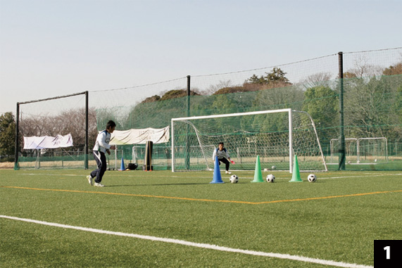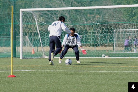 一対一の基本的な考え方は、「相手選手の選択肢を限定する」こと。このトレーニングでは、相手選手は①ダイレクトシュート、②ドリブルしてからシュート。そして実際の試合ではさらに③横パスを出して違う選手がシュートする、という3つの選択肢を持っている。