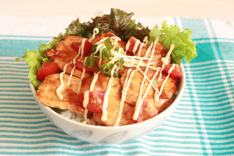 3. 器にごはんを盛り、サニーレタスを端に敷き2の照り焼きを並べ、トマト、貝割れ菜をトッピングする。【ガーリックマヨネーズ】を全体にかけてできあがりです。