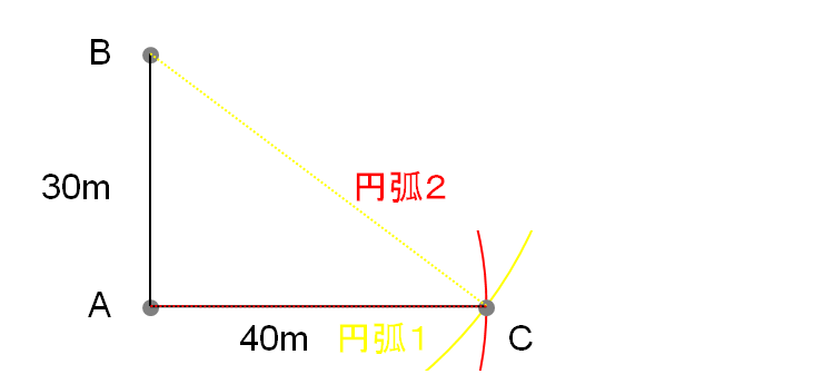 次に、A地点から40mの円弧を描きます(円弧2)。円弧1・円弧2の交点がC地点となります。