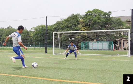 写真2は1対1になった時の構え。間合いを詰めた際は背後へのシュートは選択肢としてなくなるので、構えを低くします。写真3と比較しても分かるように、身体の斜め前に腕を伸ばしたほうが、たとえシュートに反応できなかったとしても、腕に当たる可能性も高まります。