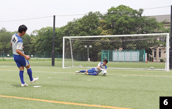 シュートする方向が決まっているからといって、打たれる前に動いて対応したのでは、試合でも「一か八か」の反応になってしまいます。必ず打たれてから対応する習慣を身につけましょう。