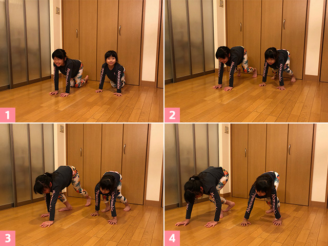 ①床に両手と膝をついた四つ這いの姿勢から膝を浮かしスタート。