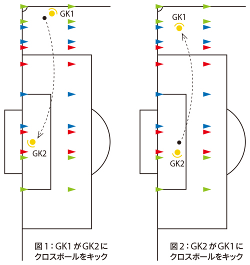 今回は、横からボールが来るクロスへの対応と、縦からボールが来るクロスへの対応についてのトレーニングを紹介する。お互いにボールを蹴り合うので、キックのトレーニングも含まれている。