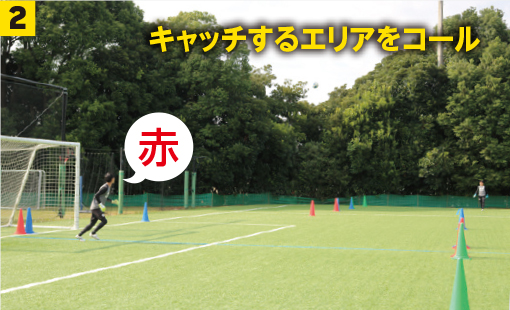 GK2はボールの落下地点を見極め、キャッチできるエリアの色をコール。