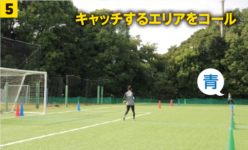ポイントは、❷と❺のキャッチするエリアをできるだけ正確に早くコールすること。コールが速ければ、判断も早くできていることになる。ただ、クロス対応の目的は、ボールに対して高い位置(打点)で、できるだけ前でプレーすること。ボールに対してプレーしているときが一番大切なので、エリアを言い当てることが目的にならないように注意しよう。