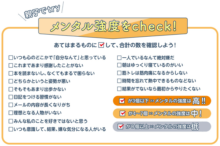 強い心を育むには、サカママはもちろん、子ども自身の行動も大切。ここでは、日々の生活の中でできること、ちょっとした心がけをご紹介。それぞれが、できることから取り入れてみて!
