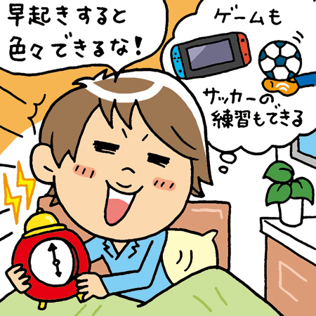 朝、自分の意思でスタートしていますか? 学校や仕事に間に合うように仕方なくスタートしてしまうと、時間に追われ、自分で時間をコントロールできている感覚が持てなくなってしまいます。朝は、自分のやりたいことのために時間を決めて起きることです。そして、20分、30分でも自分のために時間を使うこと。そうすれば「朝起きて、やりたいことができた」という自信を見出すことになり、それが自己効力感を高めることにつながるのです。また、「自分が決めた時間に起きた」ということだけでも、自信の一つに。朝が充実すれば、今日1日頑張るぞというモチベーションを高めることにもなるものです。心を強くするためにも、早起きの習慣をつけましょう。