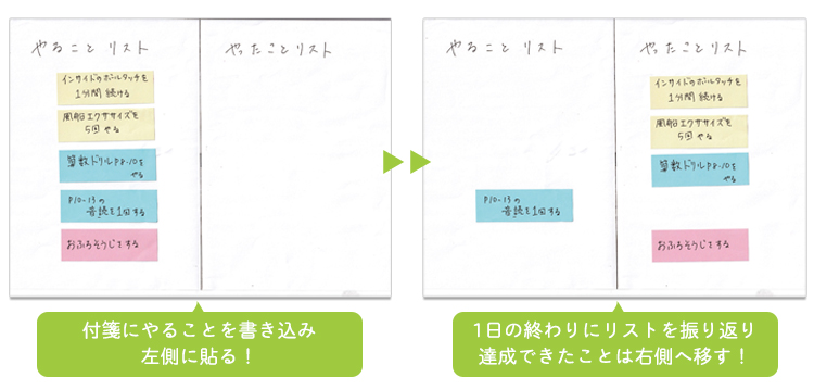 紙を2分割にし、左に「やることリスト」、右に「やったことリスト」と記す